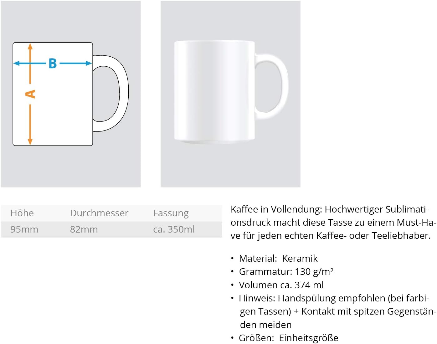 ¿Buscas una nueva moda o una exquisita idea de regalo y quieres un diseño único? Sin problemas. Este diseño se fabrica después de tu pedido para ti y enviarlo a tu dirección, por supuesto, no tarda más tiempo, sino que recibirás tu artículo en 3-5 días. Fabricado en Alemania – Exclusivo – fabricado por Spirit Shop. Detalles del producto: el clásico de la vieja impresión de sublimación hace que esta taza sea imprescindible para cualquier verdadero amante del café o del té. Material: taza de cerámica de alta calidad, gramaje: 340 g. Volumen: 330 ml. Extras: blanco brillante, superficie de talla única (altura 80 mm, diámetro 80 mm, diámetro de 80 mm, aprox. 130 g) inmediatamente después de realizar el pedido, tu producto se fabrica exclusivamente para ti y se envía dentro de dos días laborables. Por lo tanto, recibirás tu ejemplar único no solo en breve, sino que también conservamos el medio ambiente, ya que producimos nuestros productos exclusivamente bajo pedido.